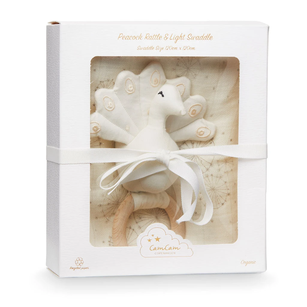 Cam Cam Copenhagen Gift Box With Printed Organic Cotton Swaddle And Peacock Rattle – Dandelion Natural