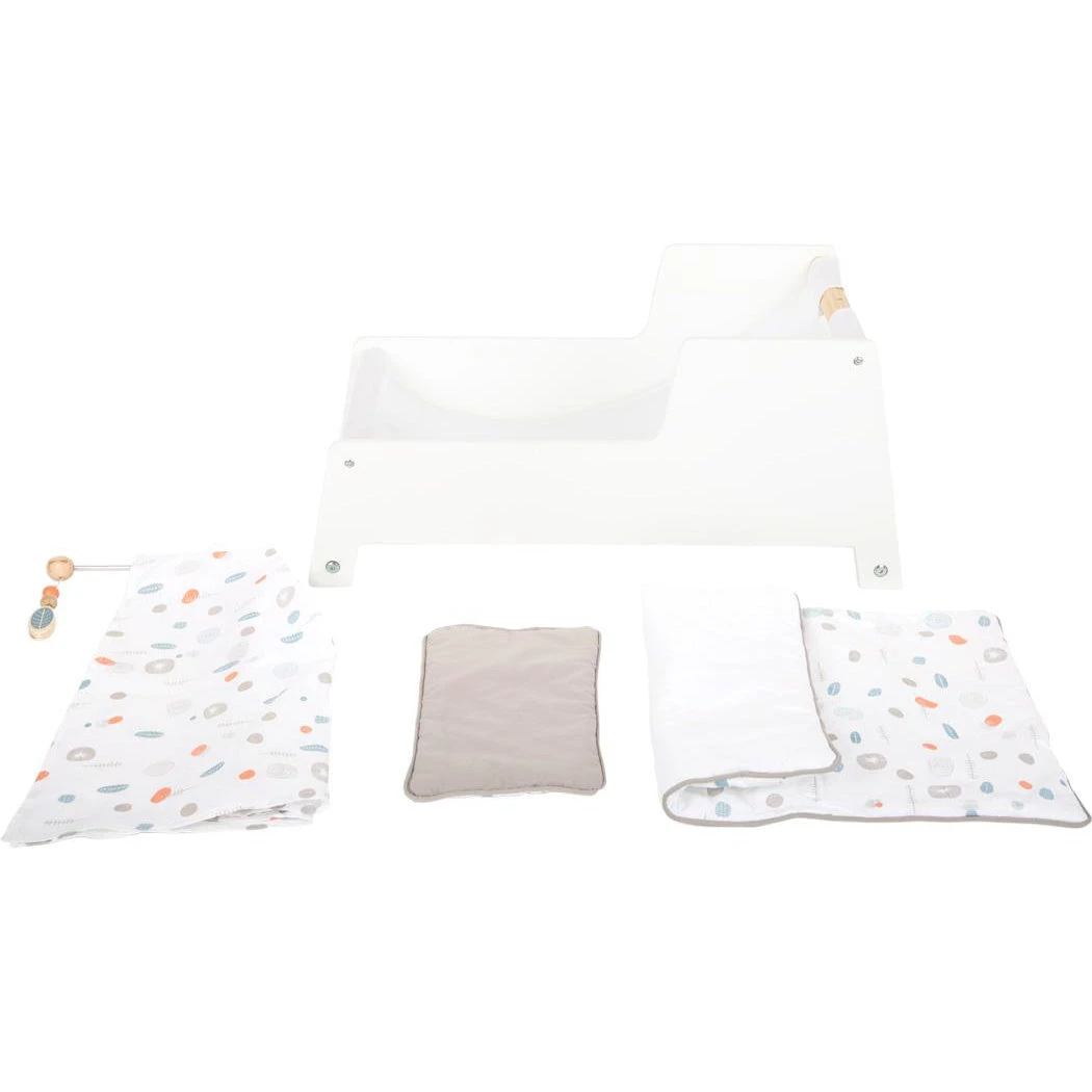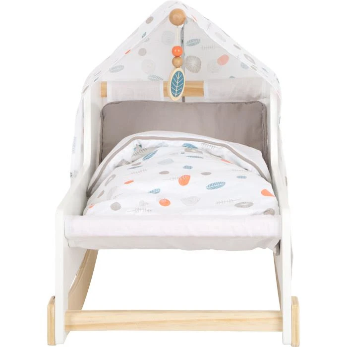 This contemporary rocking cradle boasts a Scandinavian aesthetic, subtle configuration, and reliable operation, and can accommodate dolls and stuffed animals up to 46 cm in size. The reversible, gender-neutral bedding and ample blanket provided ensure peaceful slumber beneath the canopy.