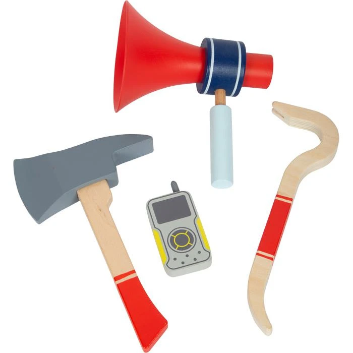 This complete set includes a wooden toy axe, a wooden crowbar, and a water sprayer with a lever and rope. The hose/rope parts can be attached to the backpack, turning the backpack into a portable water tank! The play set is rounded out with an adjustable plastic helmet, toy radio, megaphone, and foldable hazard sign with a chalkboard surface on which the kids can provide info about what’s happened. Add-on tip: Chainsaw (12362).