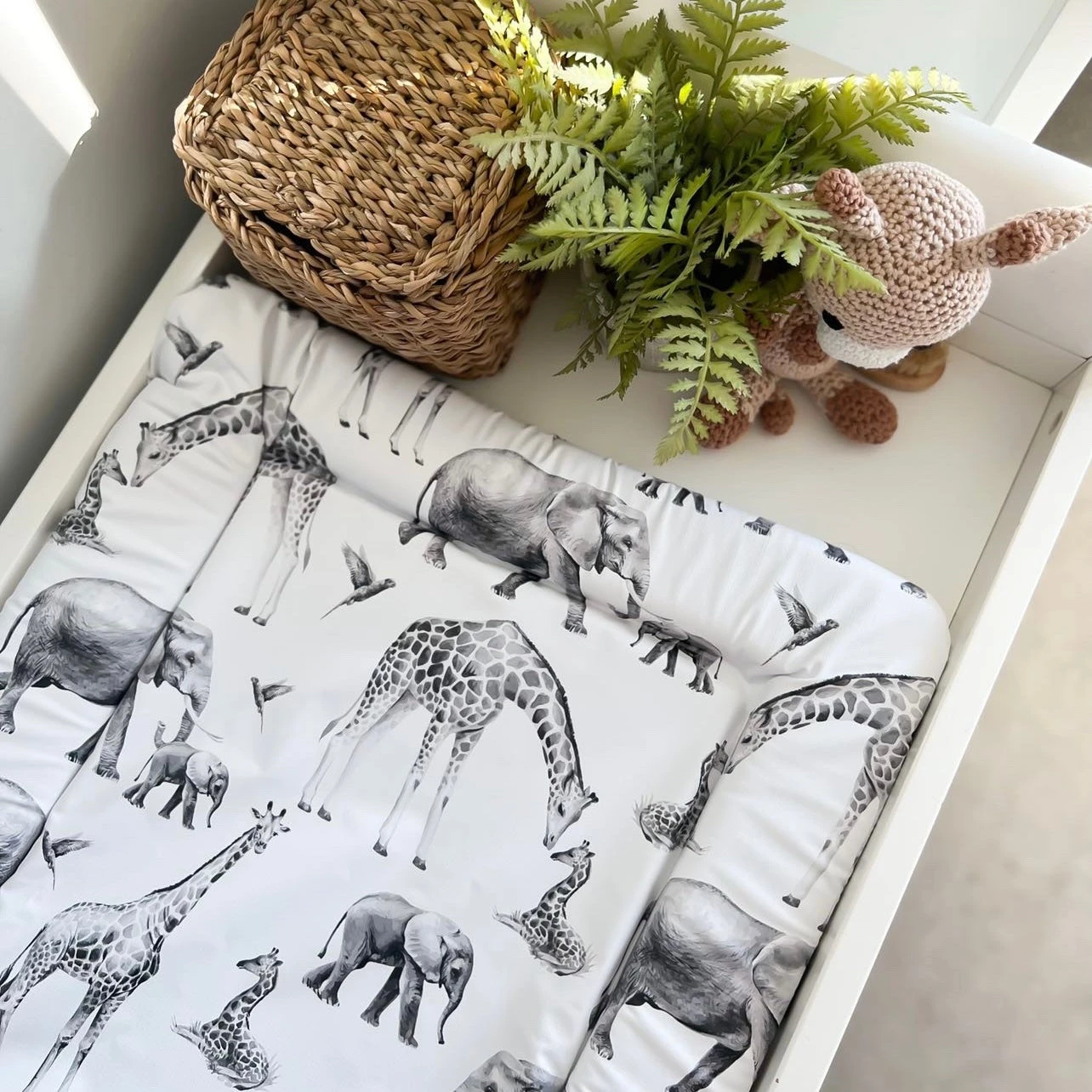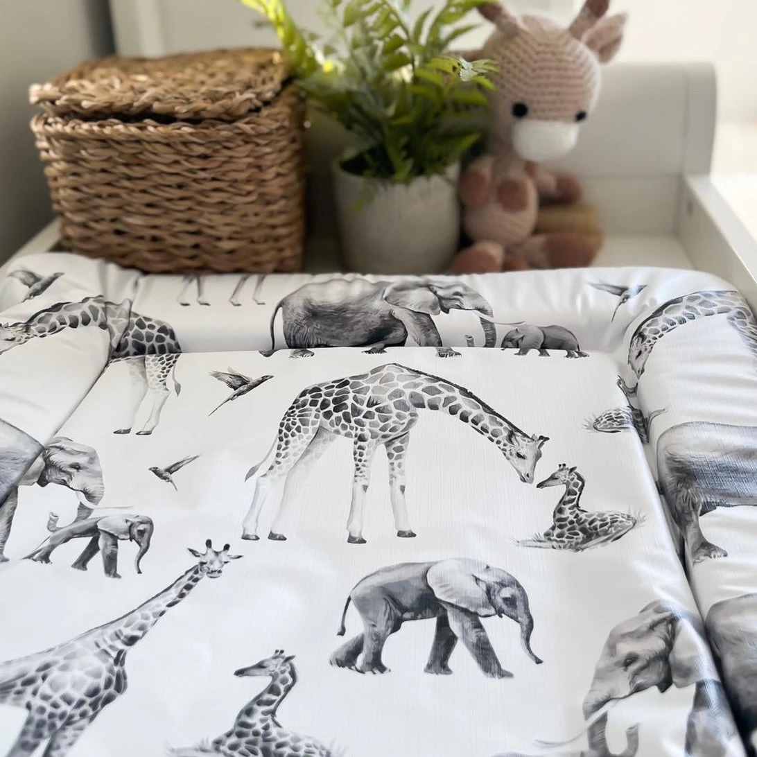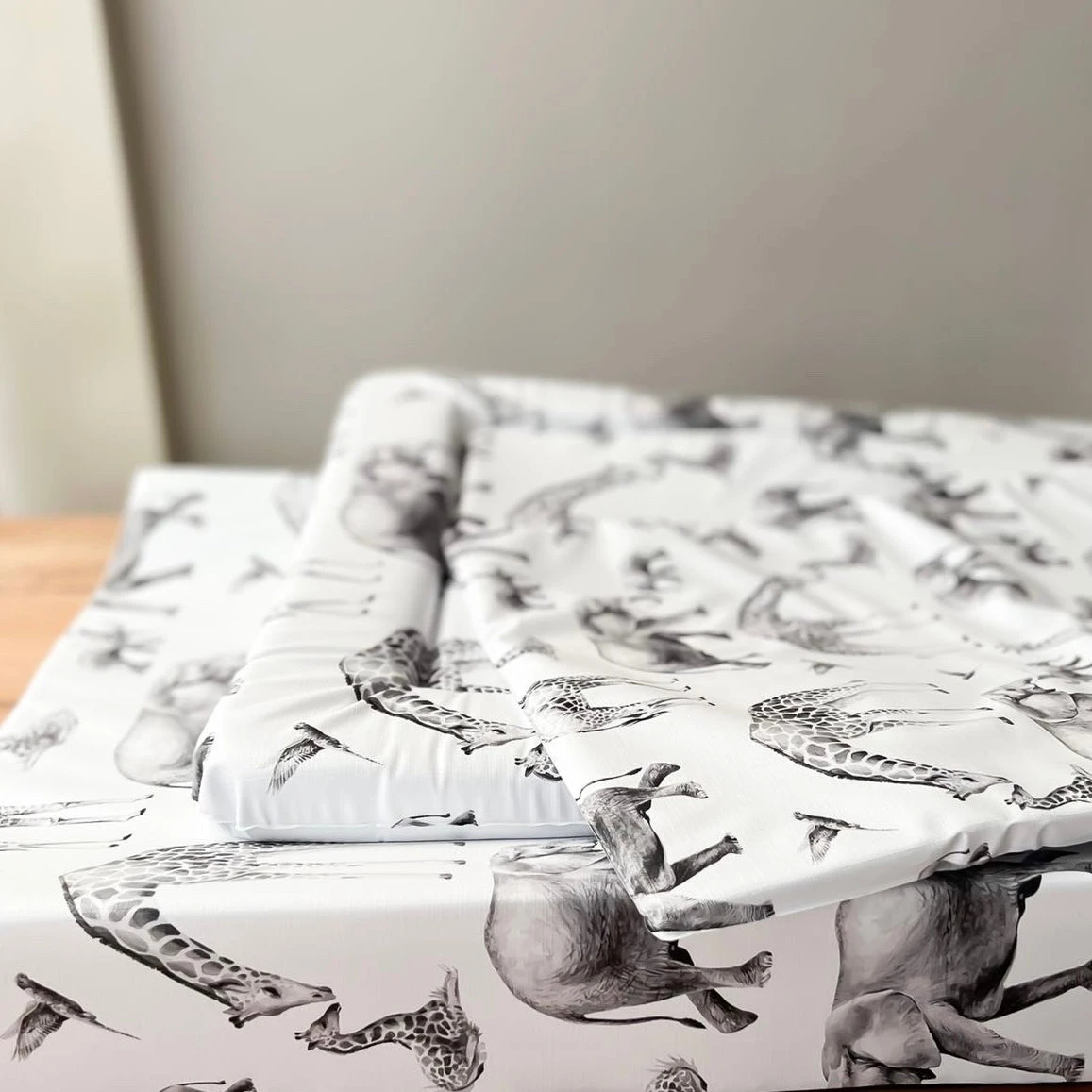 Our luxury Grey Safari Animal Print Changing Mats, available in all sizes, are the ideal addition to any nursery and boast superior quality. Crafted in England with a wipeable, waterproof PVC and phthalate-free British foam meeting Nursery Grade Standard, these mats promise ultimate reliability.