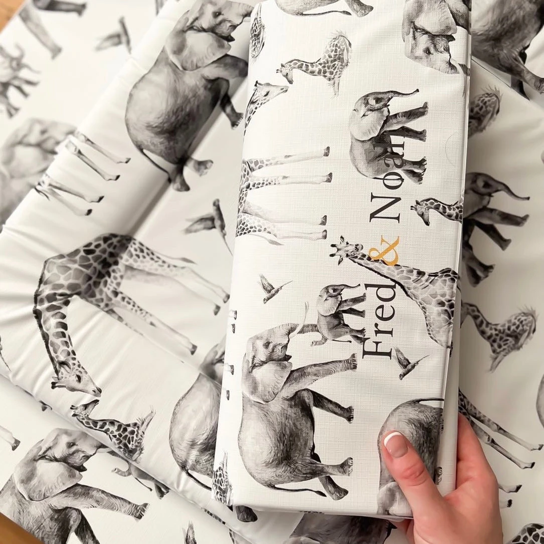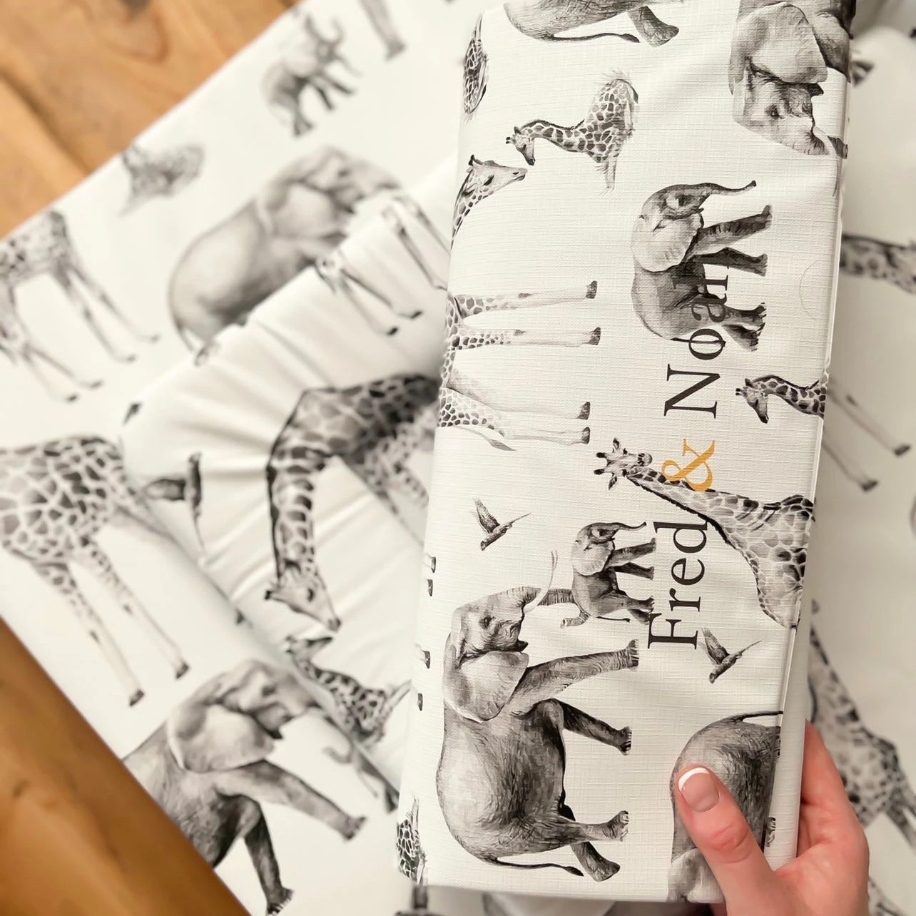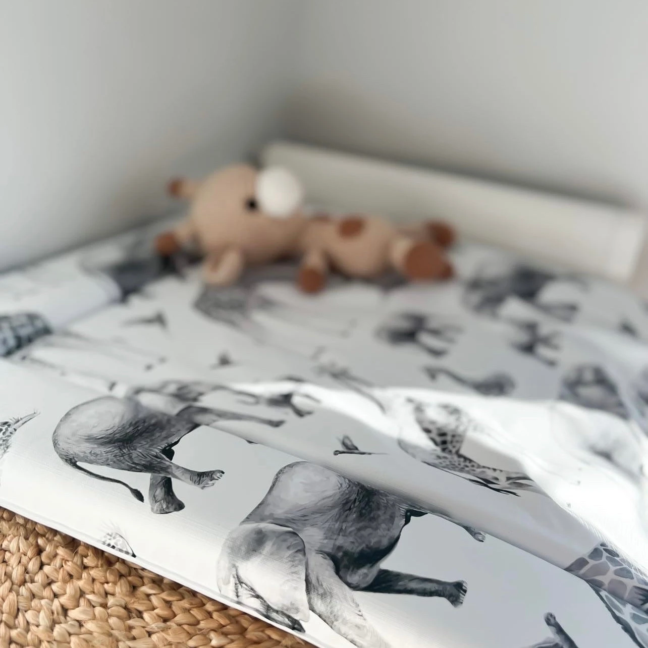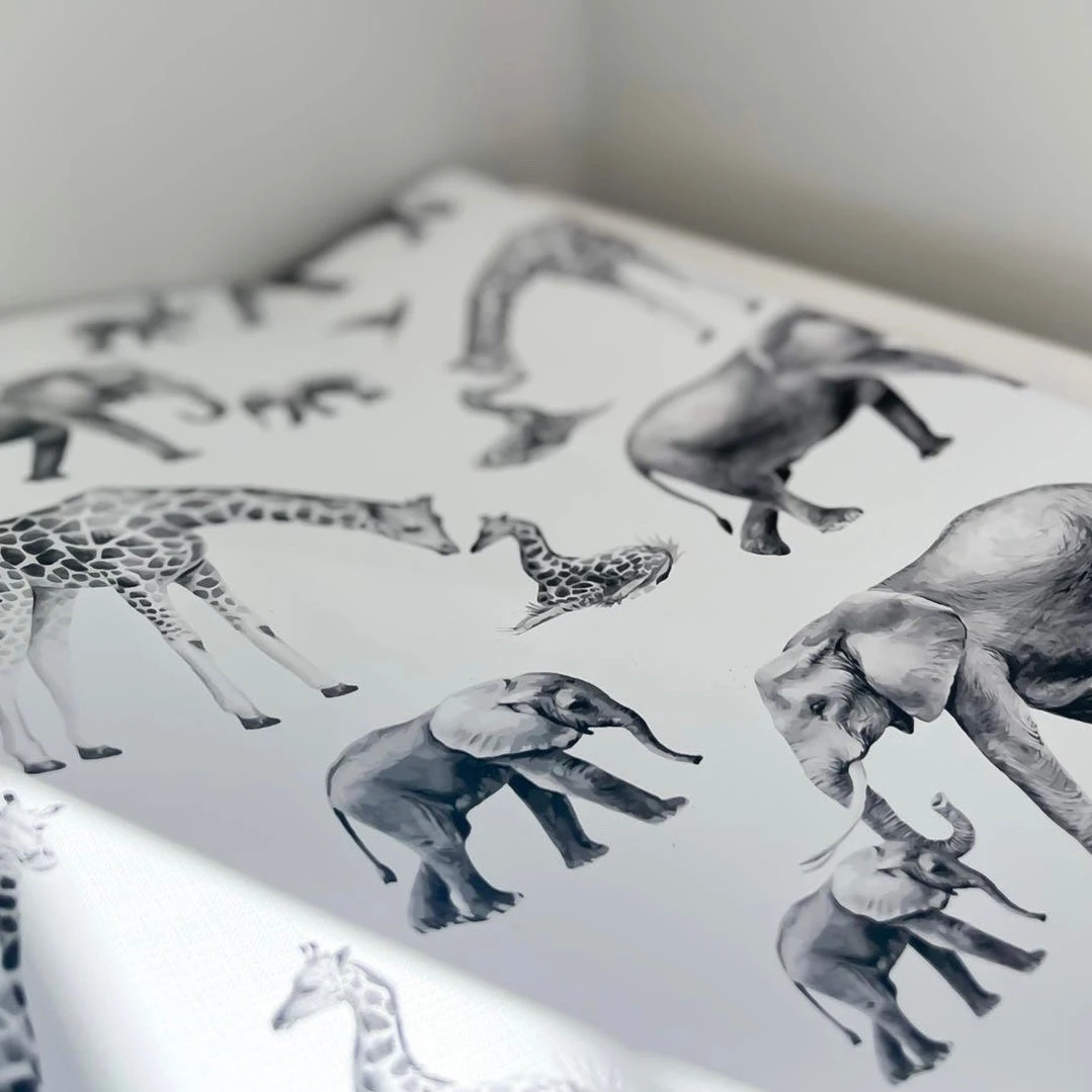 Our luxury Grey Safari Animal Print Changing Mats, available in all sizes, are the ideal addition to any nursery and boast superior quality. Crafted in England with a wipeable, waterproof PVC and phthalate-free British foam meeting Nursery Grade Standard, these mats promise ultimate reliability.