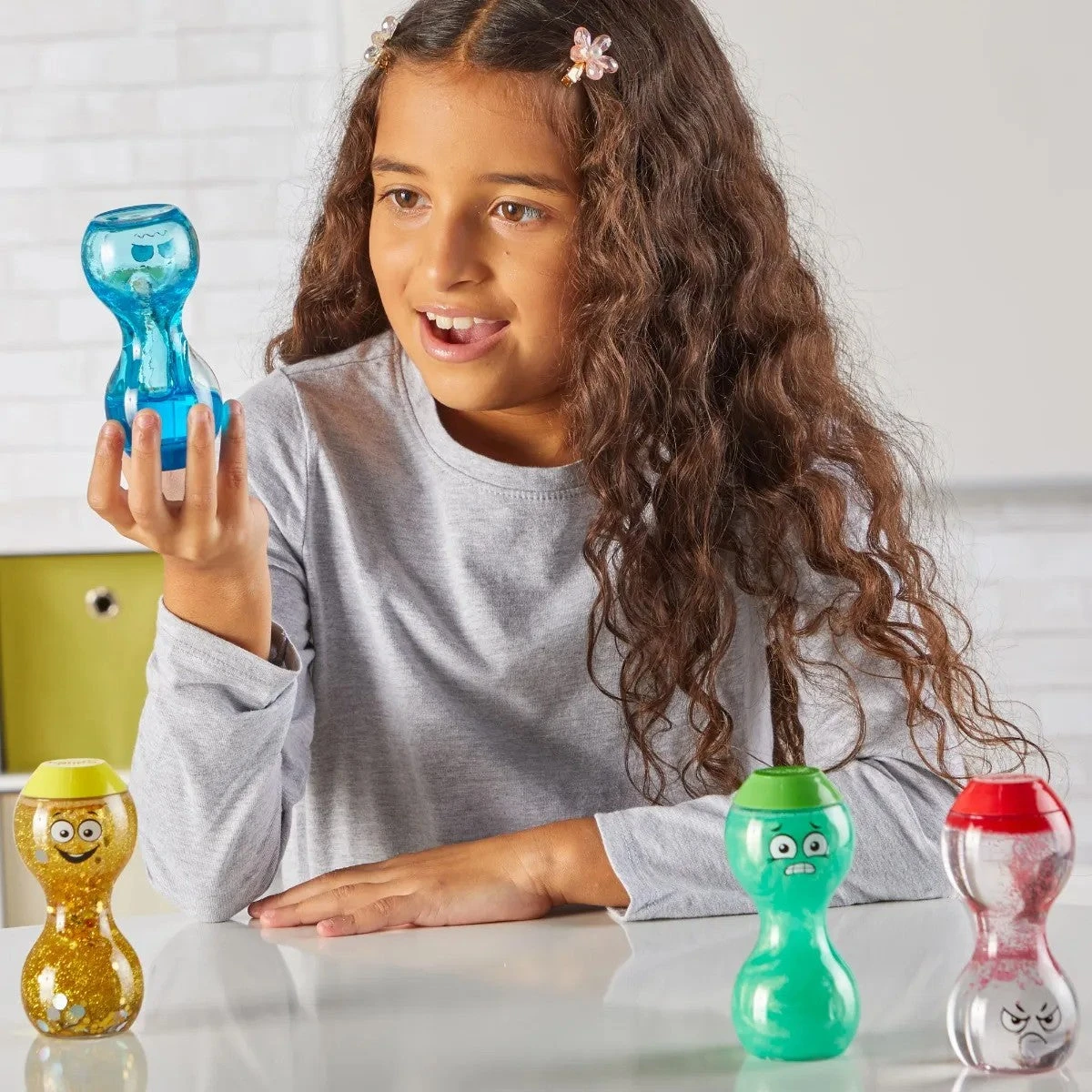 Whether happy, sad, scared, or angry, the simple expressions, colours, and motion in each of the 4 mesmerising sensory bottles in this set help children identify and express their feelings and emotions.