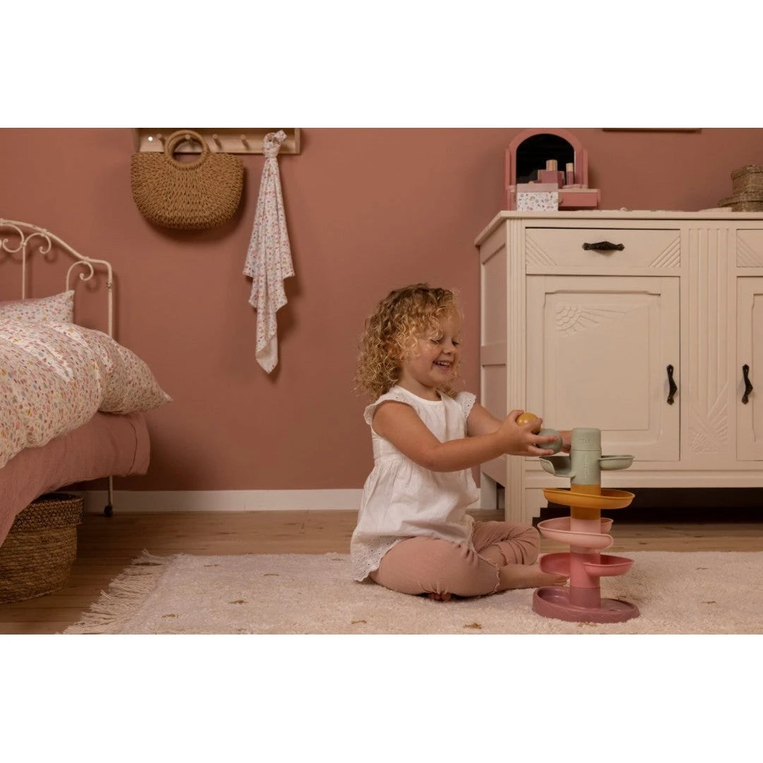The Spiral Tower comes with three big easy-to-grip balls in different colours that make a little sound when moving.