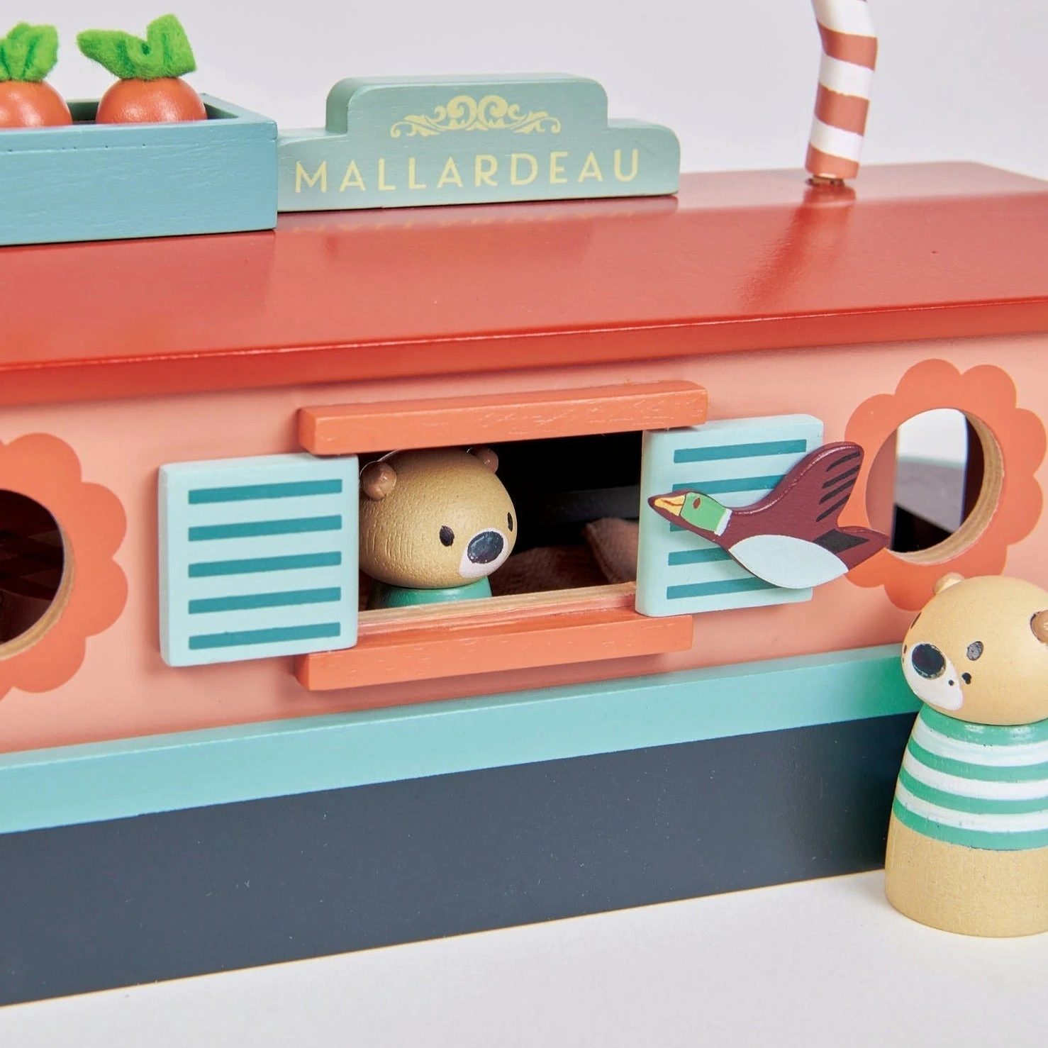 Discover a charming, wooden Little Otter Canal Boat made by Tender Leaf Toys, adorned with a special mallard duck adorning the front end. This houseboat is a fun twist on the classic dollhouse selection from the Tender Leaf collection, featuring many accessories ideal for assisting in language development, emotional intelligence enhancement, and imaginative story-telling for young children.