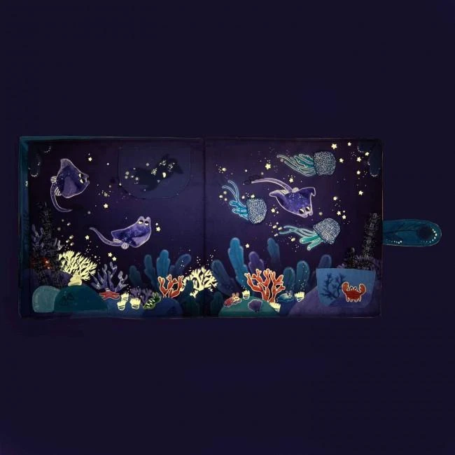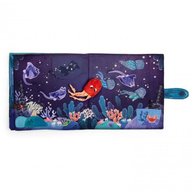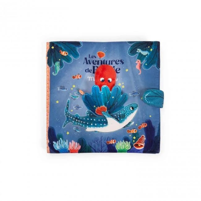 Large fabric book with lots of illustrations, entitled ‘Les aventures de Paulie’ (Paulie’s adventures). The octopus rattle can hide in each of the 6 sensory activity pages. The last pages are glow-in-the-dark to illustrate the seabed.