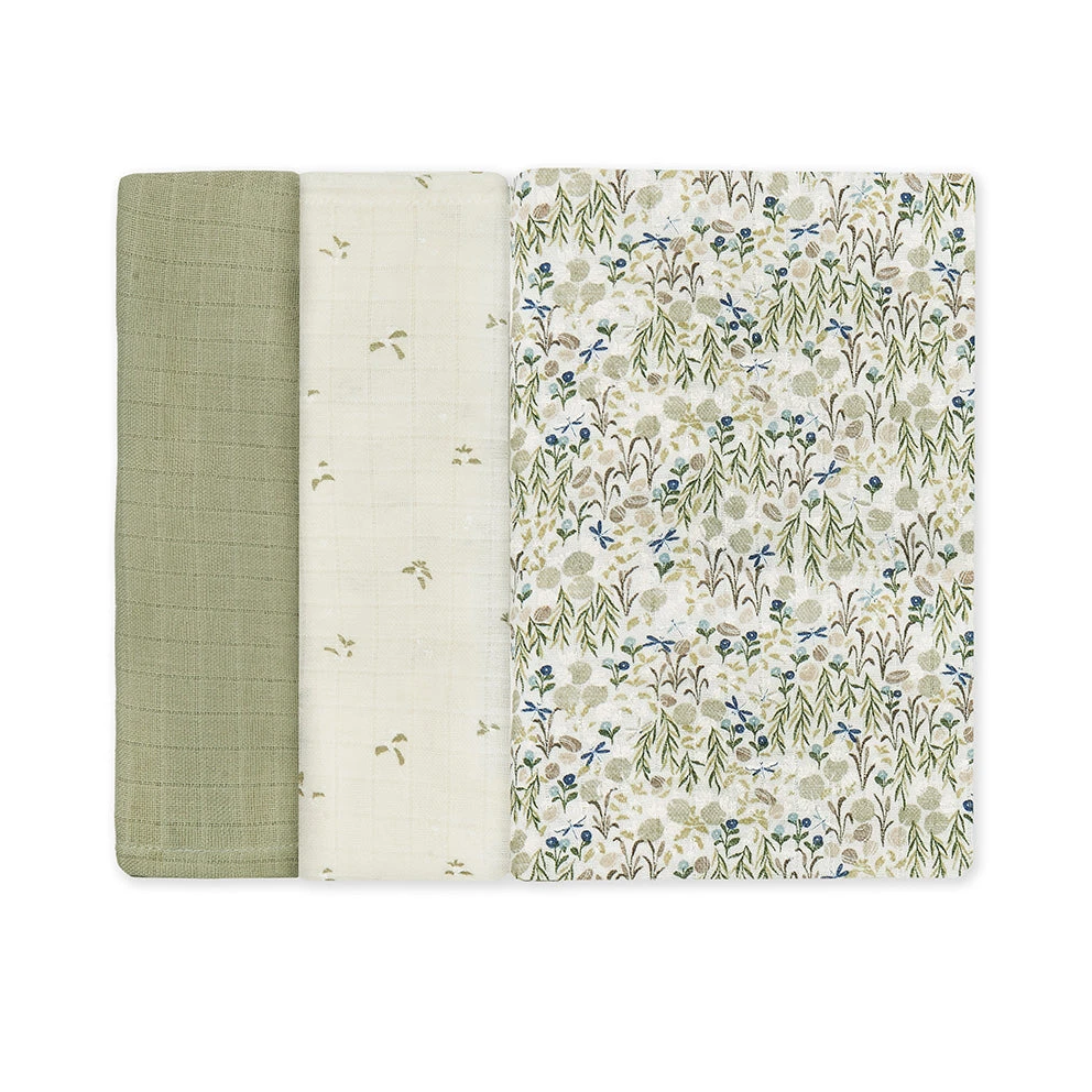 Set includes 3 muslin squares in Riverbank, Nettle Scatter and Willow.