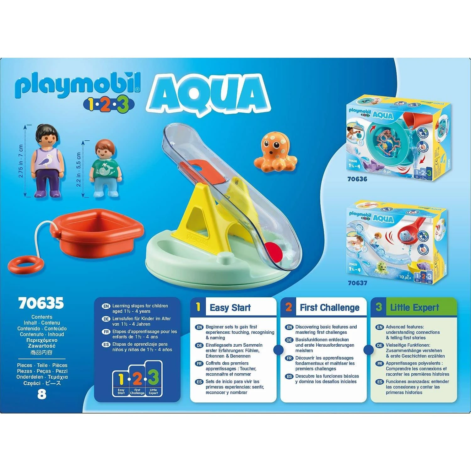 The set contains two PLAYMOBIL 1.2.3 figures, an octopus, a bathing island with water slide and a boat. PLAYMOBIL 1.2.3 AQUA playsets playfully promote fine motor skills and an understanding of relationships. Using the red marked elements, water fans immediately discover the various play functions. The swimming island, the boat and the octopus are buoyant. The Water Seesaw can be ideally combined with set 70636 Water Wheel with Baby Shark.
