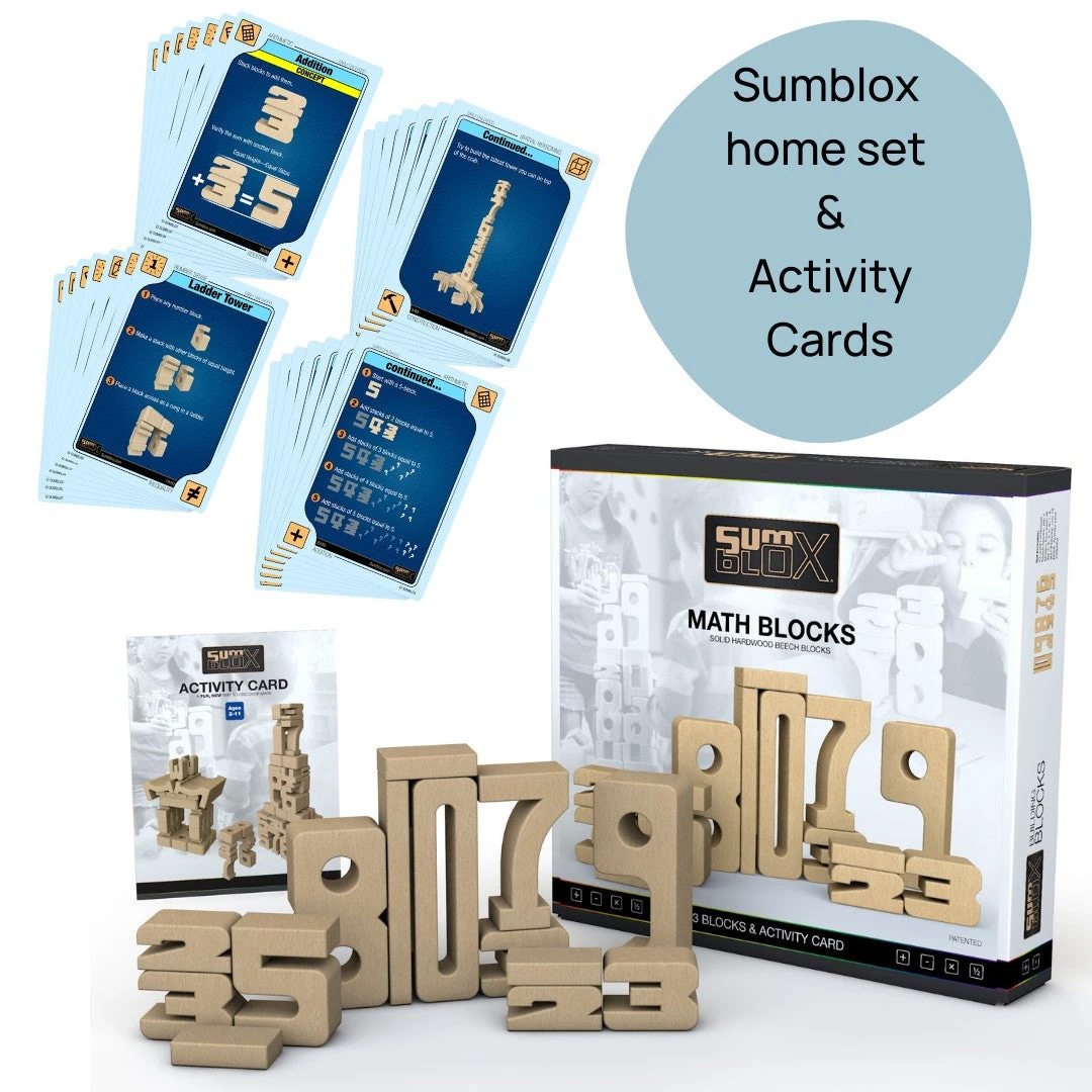 Sumblox 43 Piece Home kit includes: 43 solid hardwood beech blocks ten 1 blocks; 4 each of the numbers 2, 3, 4, 5, 6, 7, 8, and 9 blocks; one 10 block.