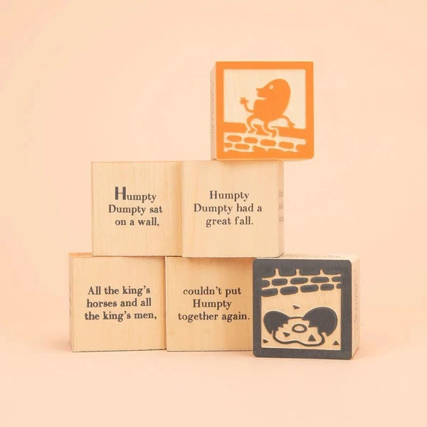 Enjoy the soft, refined color palette. Note the illustrated drop caps that signal the start of every nursery rhyme. Then, spin each block to the left to read the story. A storybook font compliments this whimsical approach. Will Jack fall down? And break his crown? You’ll have to buy a set to find out.